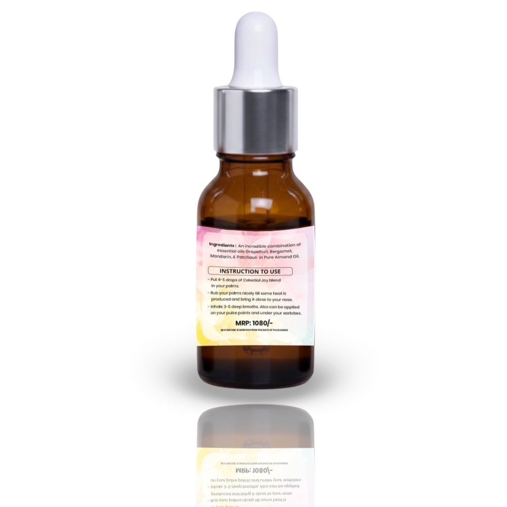 Celestial Joy, a thoughtfully crafted aroma blend designed to uplift your mood and restore inner balance. Infused with the refreshing essence of Grapefruit, Bergamot, Mandarin, and grounding Patchouli in pure Almond Oil, this blend helps ease stress, enhance positivity, and create a joyful state of mind anytime, anywhere.
